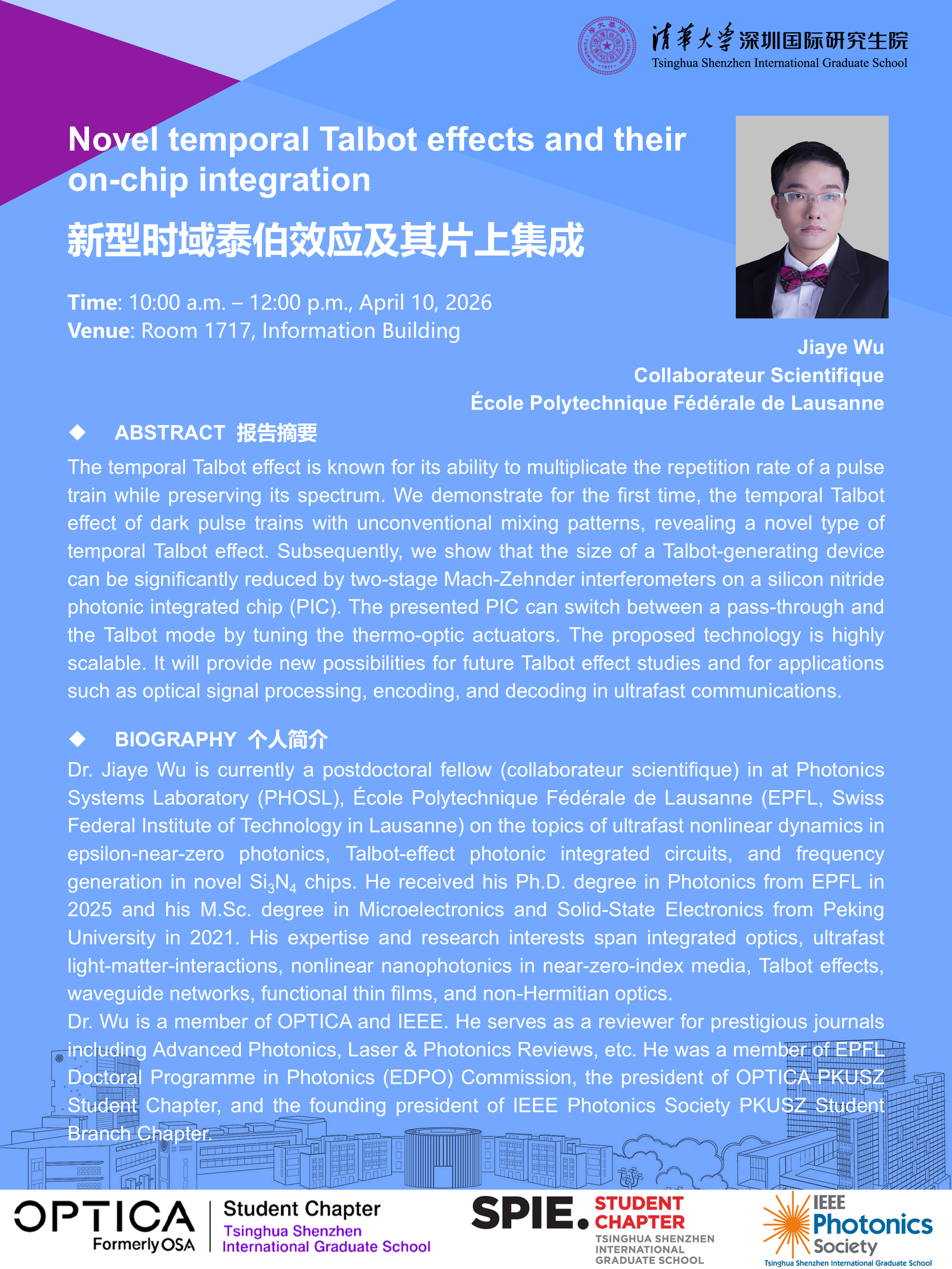 On April 10th, 2026, I was Invited by OPTICA/IEEE Photonics Society/SPIE Tsinghua SIGS Student Chapters to present a talk on Novel temporal Talbot effects and their on-chip integration at Tsinghua Shenzhen International Graduate School (SIGS), Tsinghua University, Shenzhen, China. (Wu et al., 2022; Wu et al., 2022; Wu et al., 2023)